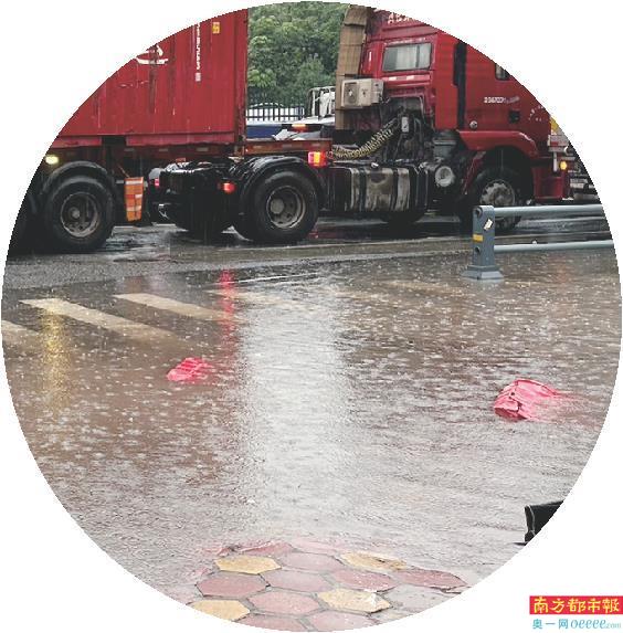 记者看到,该路段边上有多个排水口,但由于降雨量大,随着时间的流逝,路边多处可见积水的情况,最深处超10厘米以上,足以将双脚完全浸没。而在三乐路与广珠公路交会处、顺江公园边一右转道路边,水浸点深度淹没膝盖。