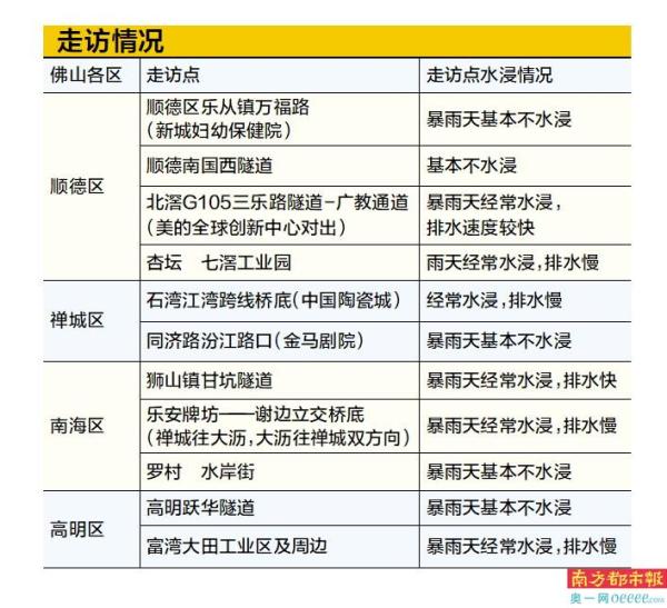 南都记者走访发现,有5个走访点几乎未水浸,包括顺德区乐从镇万福路(新城妇幼保健院)、南国西隧道、禅城区同济路汾江路口(金马剧院)、南海区罗村水岸街和高明跃华隧道。