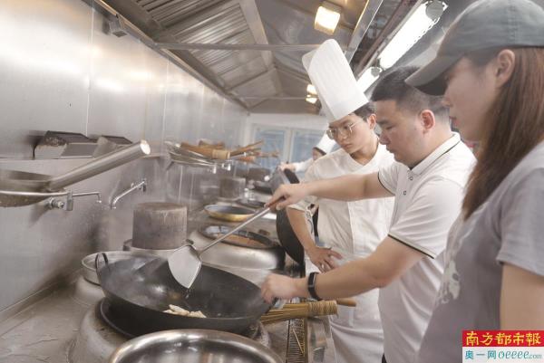 学员在厨师指导下烹饪咸蛋黄鸡翅。