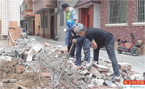 南方电网广东佛山禅城供电局电网警务室警员联合配电运维班组在城中村建设施工现场开展电力设施保护专项行动。