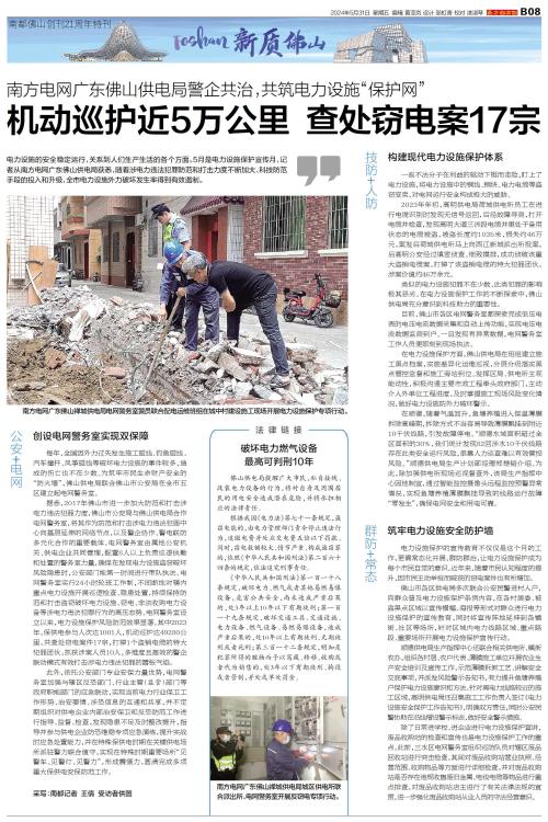 电力设施的安全稳定运行,关系到人们生产生活的各个方面。5月是电力设施保护宣传月,记者从南方电网广东佛山供电局获悉,随着涉电力违法犯罪防范和打击力度不断加大、科技防范手段的投入和升级,全市电力设施外
