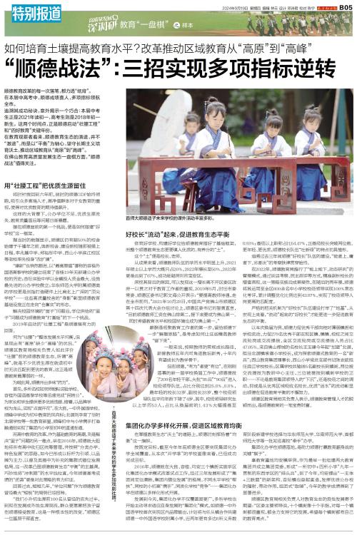 教育“一盘棋”之样本 顺德教育改革的每一次落笔,都力透“纸背”。 在本届中高考中,顺德成绩喜人,多项指标领航全市。 追溯其成功秘诀,意外揭示一个巧合:本届中考生正是2021年读初一,高考生则