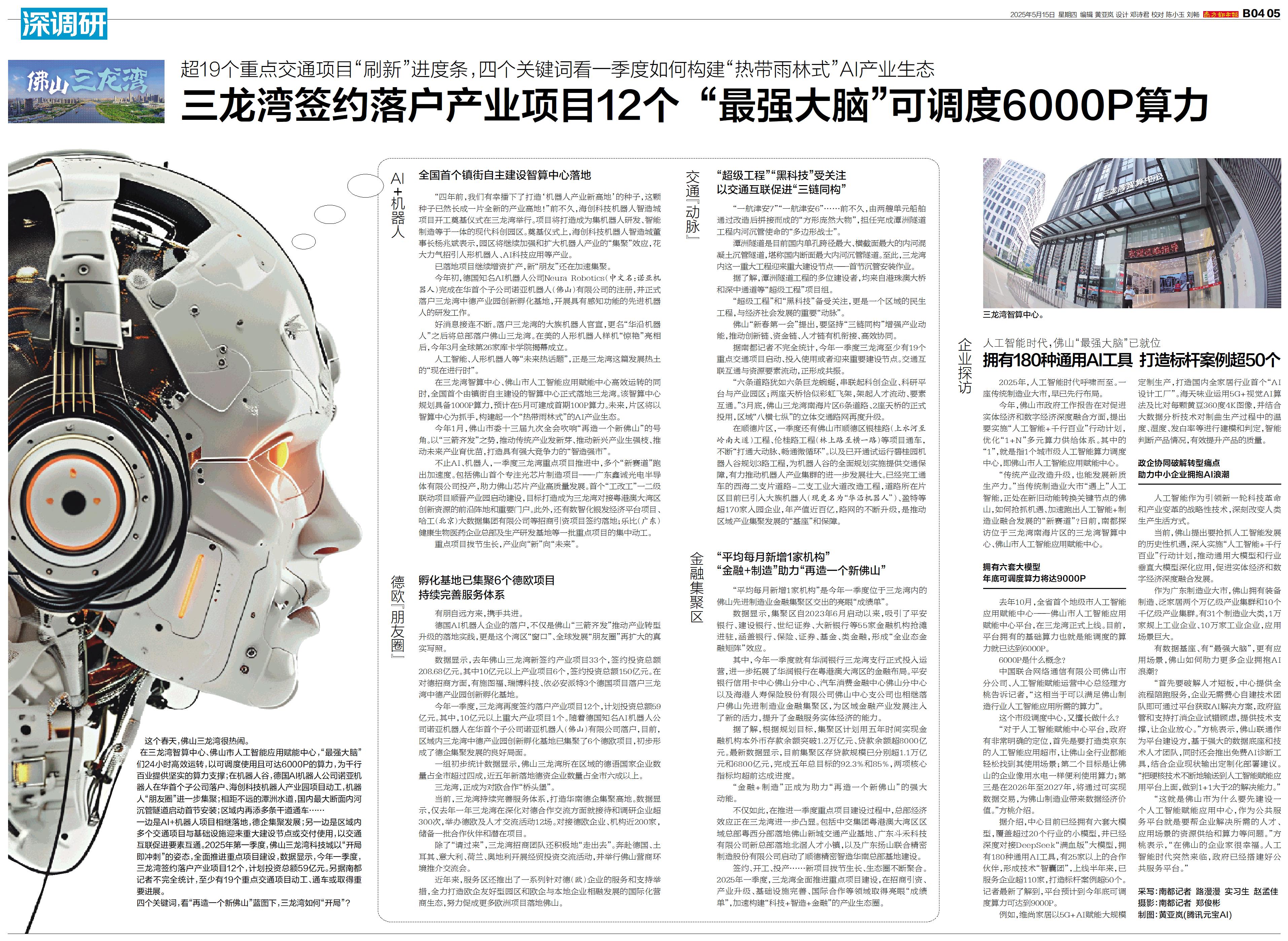 “传统产业改造升级,也能发展新质生产力。”当传统制造业大市“遇上”人工智能,正处在新旧动能转换关键节点的佛山,如何抢抓机遇、加速跑出人工智能+制造业融合发展的“新赛道”?日前,南都探访位于三龙湾南海片区的三龙湾智算中心、佛山市人工智能应用赋能中心。