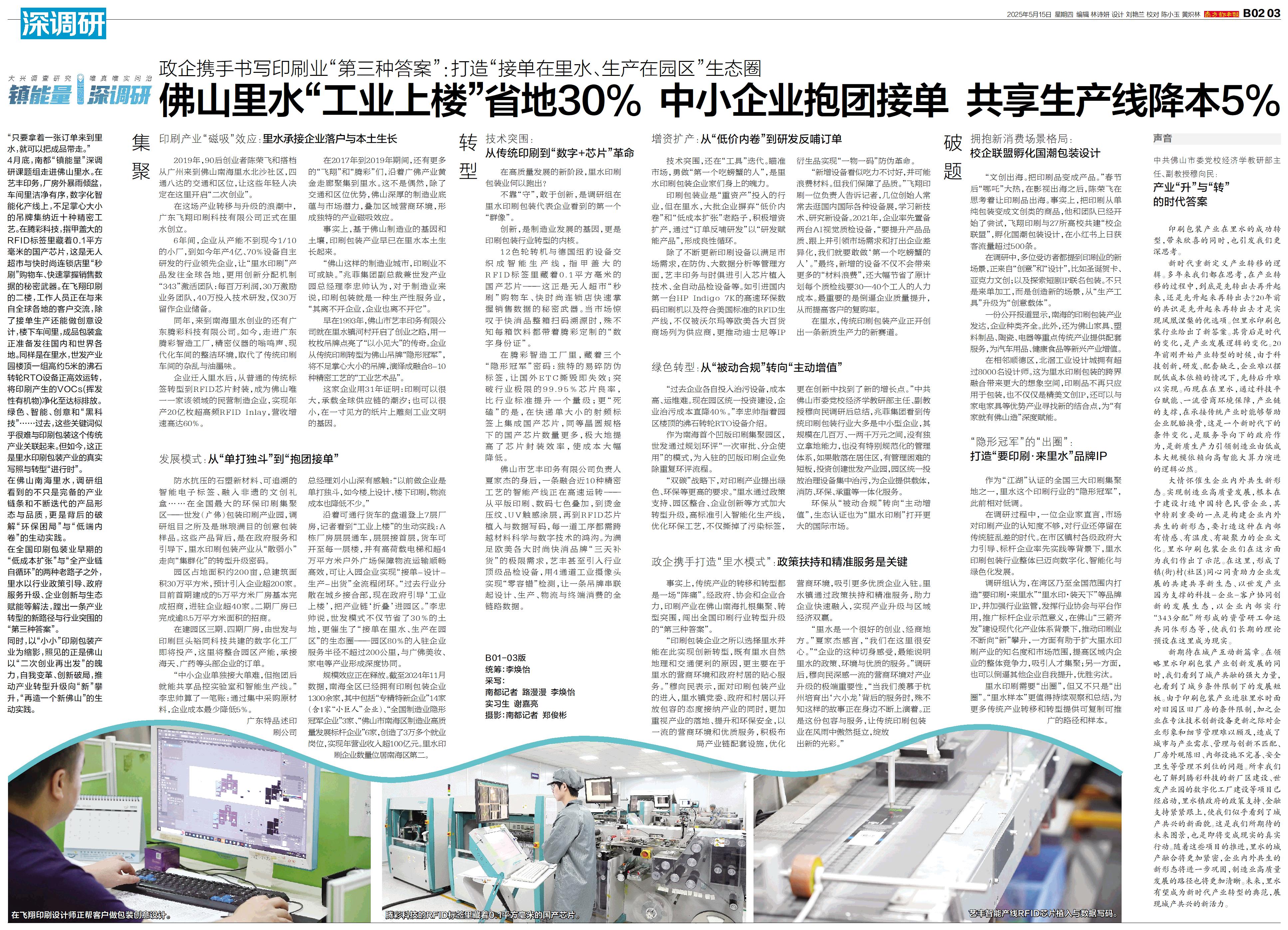 4月底,南都“镇能量”深调研课题组走进佛山里水。在艺丰印务,厂房外暴雨倾盆,车间里洁净有序,数字化智能化产线上,不足掌心大小的吊牌集纳近十种精密工艺。在腾彩科技,指甲盖大的RFID标签里藏着0.1平方毫米的国产芯片,这是无人超市与快时尚连锁店里“秒刷”购物车、快速掌握销售数据的秘密武器。在飞翔印刷的二楼,工作人员正在与来自全球各地的客户交流,除了接单生产还能做创意设计,楼下车间里,成品包装盒正准备发往国内和世界各地。同样是在里水,世发产业园楼顶一组高约5米的沸石转轮RTO设备正高效运转,将印刷产生的VOCs(挥发性有机物)净化至达标排放。