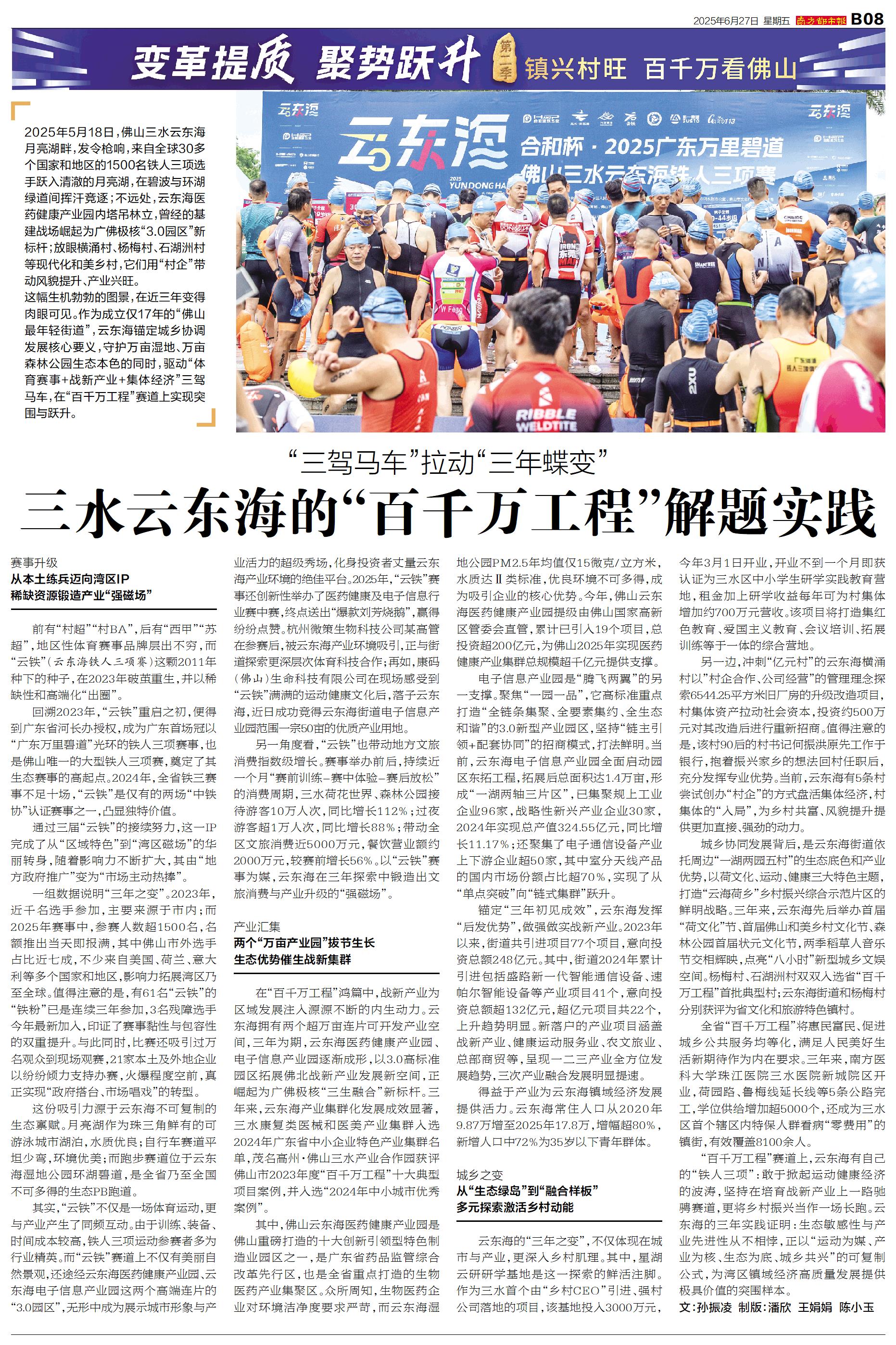 2025年5月18日,佛山三水云东海月亮湖畔,发令枪响,来自全球30多个国家和地区的1500名铁人三项选手跃入清澈的月亮湖,在碧波与环湖绿道间挥汗竞逐;不远处,云东海医药健康产业园内塔吊林立,曾经