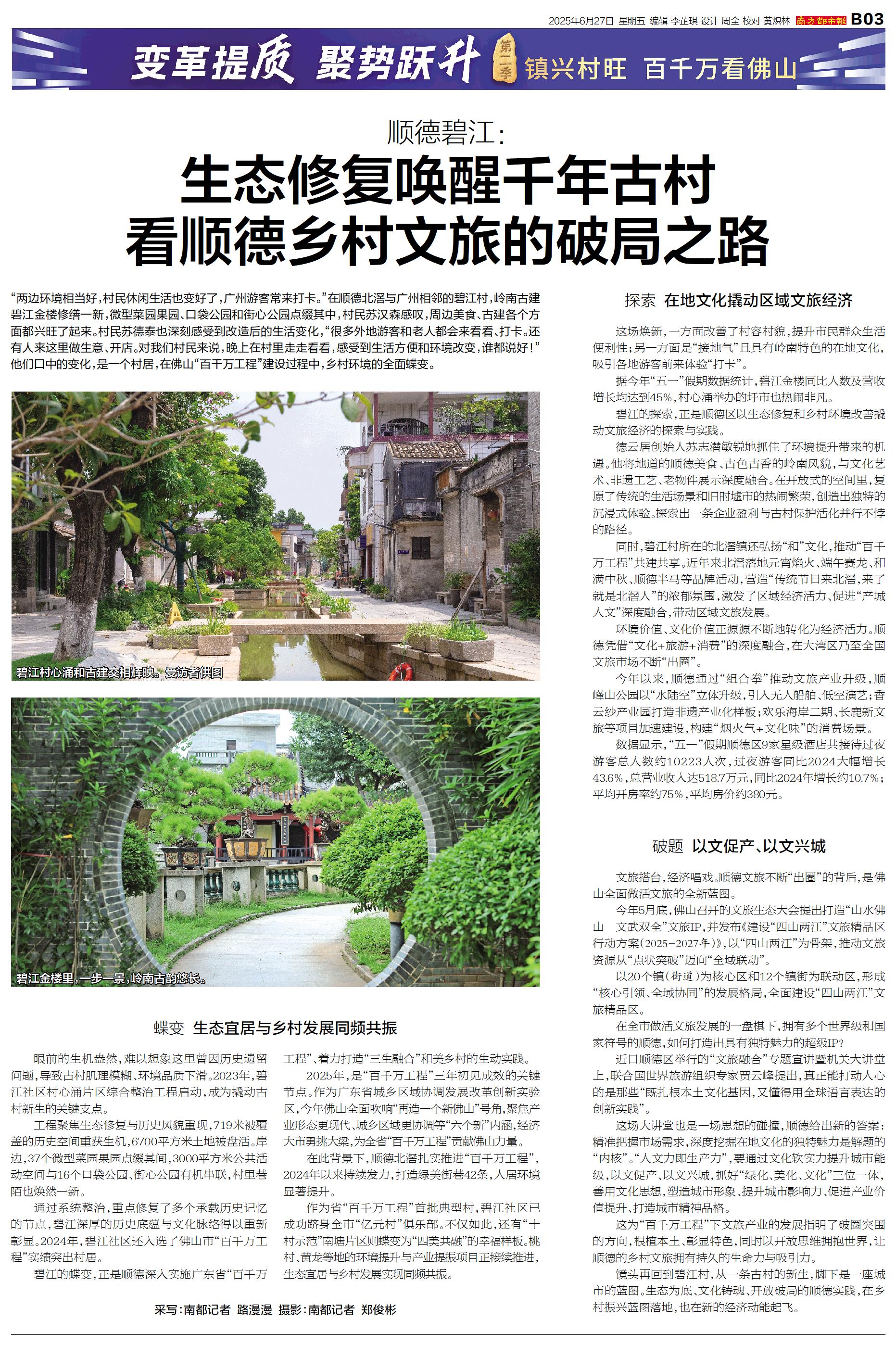 “两边环境相当好,村民休闲生活也变好了,广州游客常来打卡。”在顺德北滘与广州相邻的碧江村,岭南古建碧江金楼修缮一新,微型菜园果园、口袋公园和街心公园点缀其中,村民苏汉森感叹,周边美食、古建各个方面