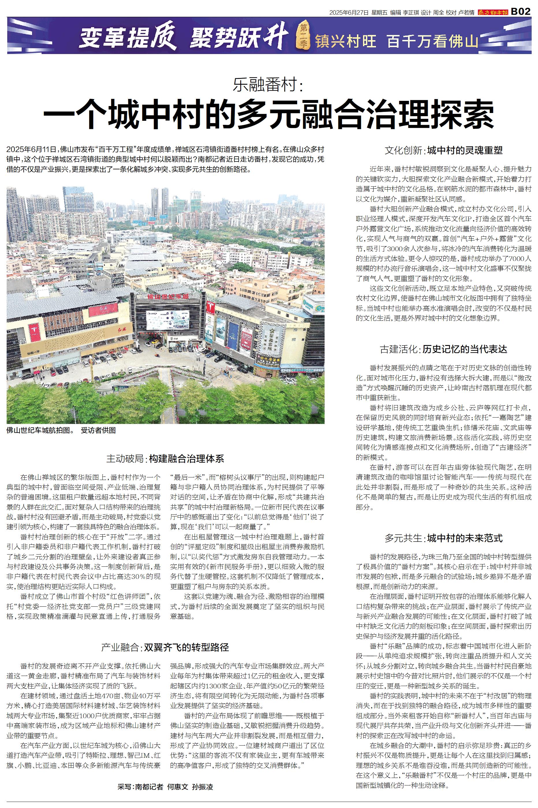 2025年6月11日,佛山市发布“百千万工程”年度成绩单,禅城区石湾镇街道番村村榜上有名。在佛山众多村镇中,这个位于禅城区石湾镇街道的典型城中村何以脱颖而出?南都记者近日走访番村,发现它的成功,凭