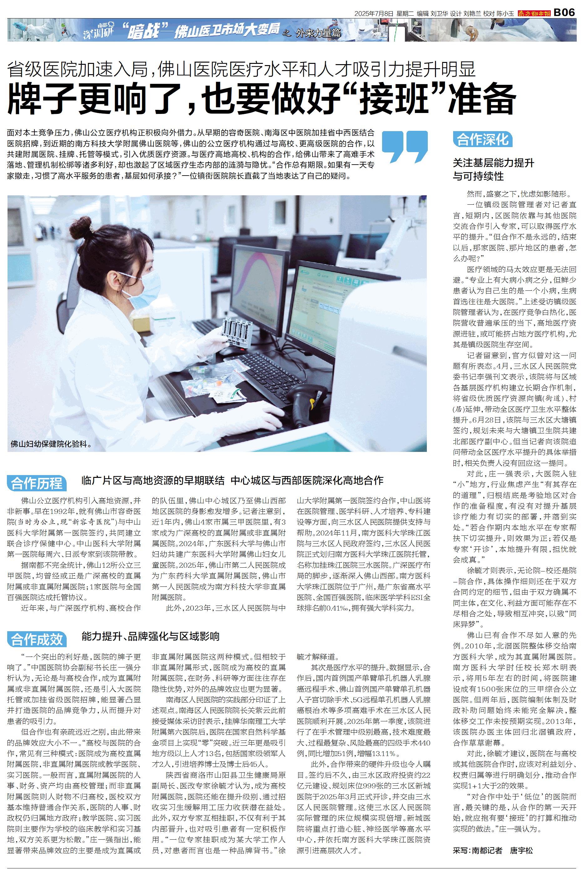 “暗战”——佛山医卫市场大变局之外来力量篇 面对本土竞争压力,佛山公立医疗机构正积极向外借力。从早期的容奇医院、南海区中医院加挂省中西医结合医院招牌,到近期的南方科技大学附属佛山医院等,佛山的公