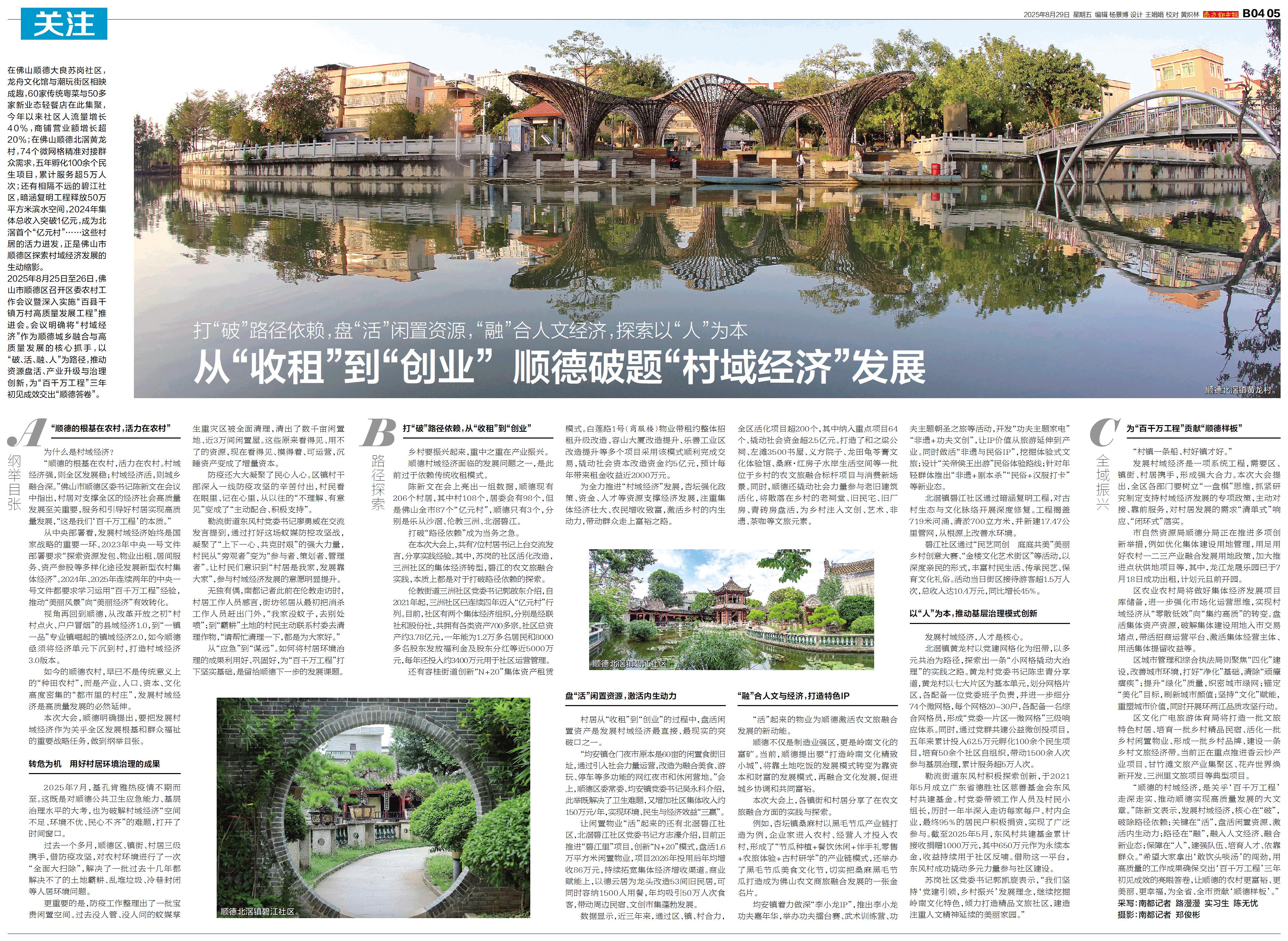 在佛山顺德大良苏岗社区,龙舟文化馆与潮玩街区相映成趣,60家传统粤菜与50多家新业态轻餐店在此集聚,今年以来社区人流量增长40%,商铺营业额增长超20%;在佛山顺德北滘黄龙村,74个微网格精准对接