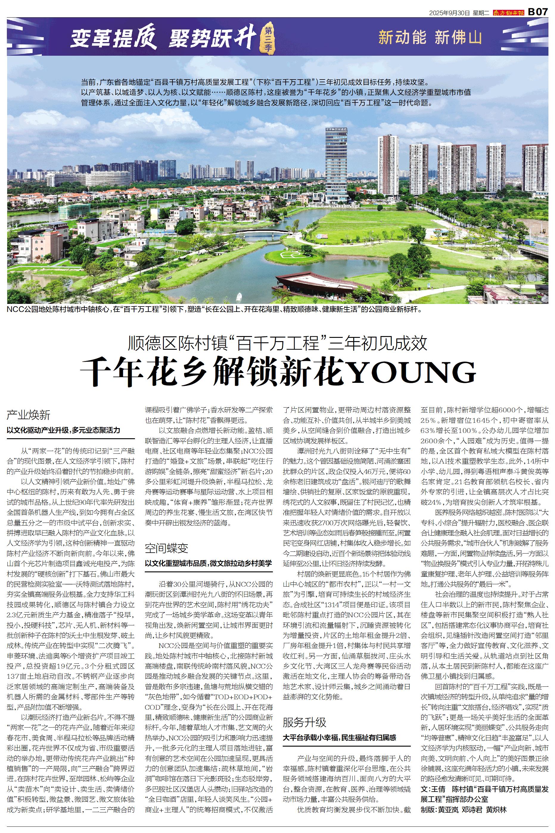 当前,广东省各地锚定“百县千镇万村高质量发展工程”(下称“百千万工程”)三年初见成效目标任务,持续攻坚。 以产筑基、以城造梦、以人为核、以文赋能……顺德区陈村,这座被誉为“千年花乡”的小镇,正聚