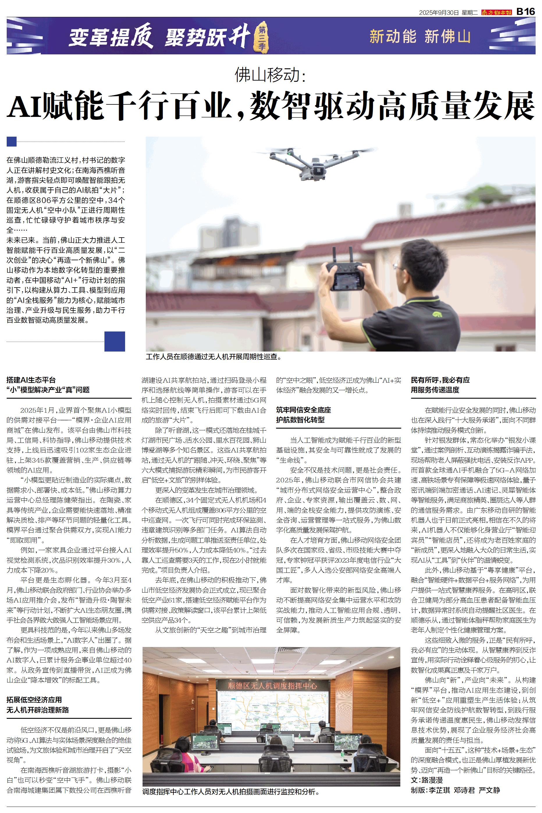 在佛山顺德勒流江义村,村书记的数字人正在讲解村史文化;在南海西樵听音湖,游客指尖轻点即可唤醒智能跟拍无人机,收获属于自己的AI航拍“大片”;在顺德区806平方公里的空中,34个固定无人机“空中小队