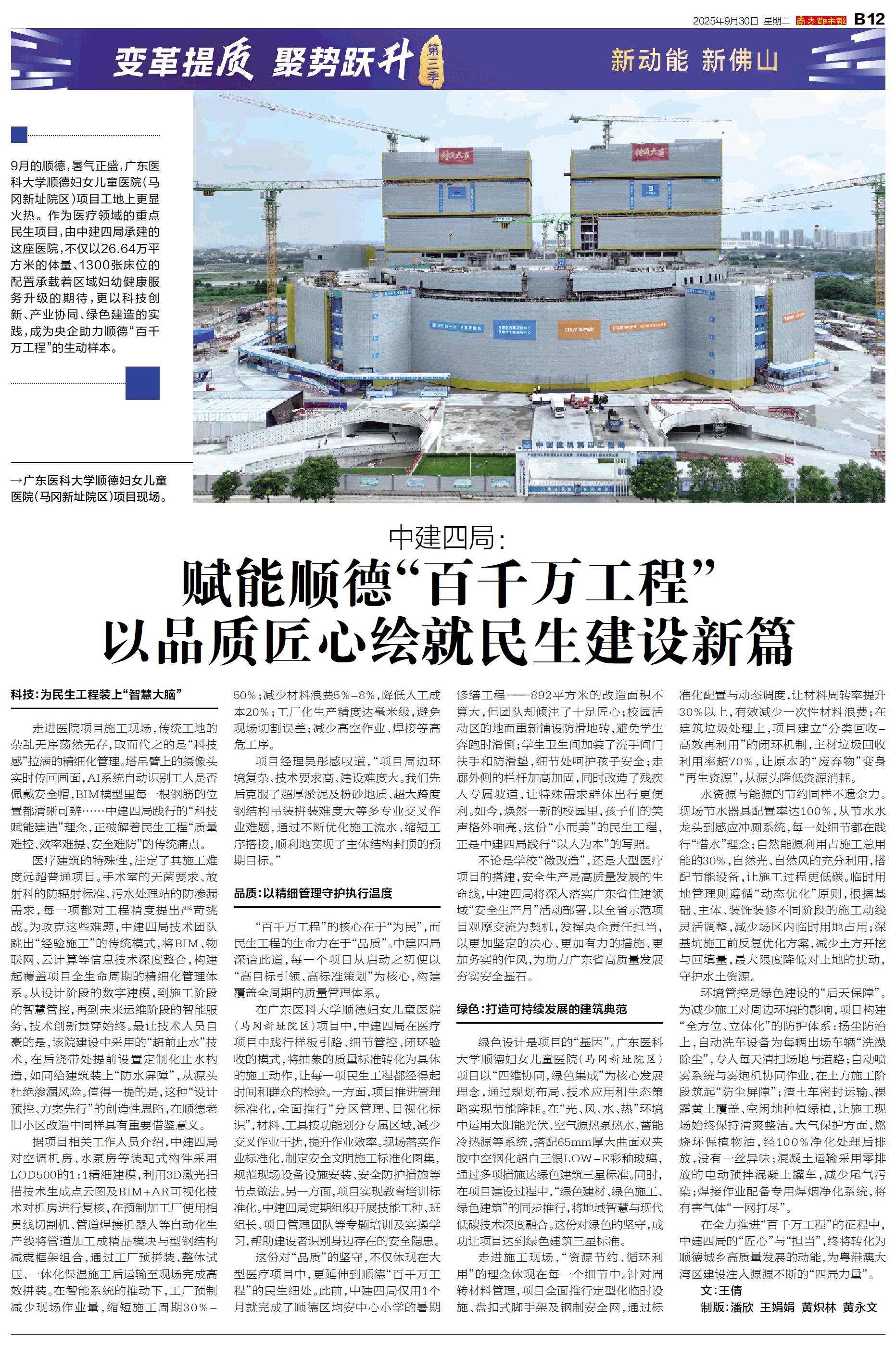 9月的顺德,暑气正盛,广东医科大学顺德妇女儿童医院(马冈新址院区)项目工地上更显火热。作为医疗领域的重点民生项目,由中建四局承建的这座医院,不仅以26.64万平方米的体量、1300张床位的配置承载