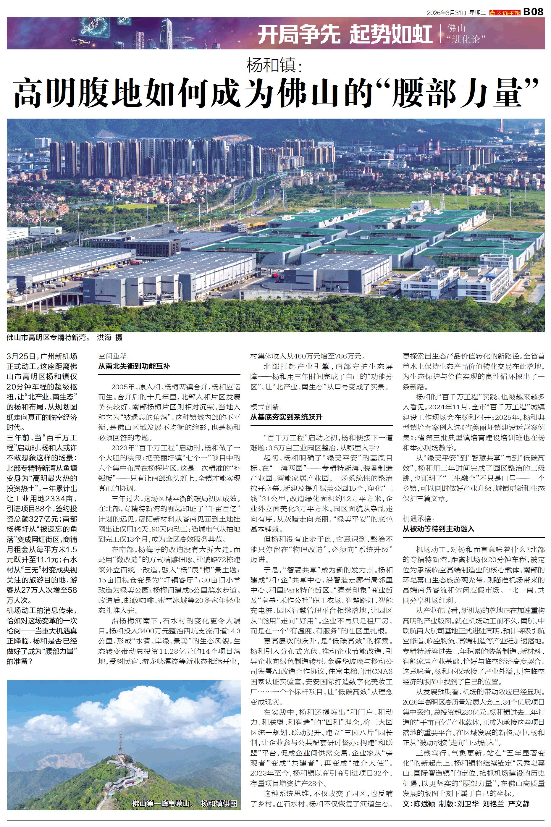 3月25日,广州新机场正式动工。这座距离佛山市高明区杨和镇仅20分钟车程的超级枢纽,让“北产业、南生态”的杨和布局,从规划图纸走向真正的临空经济时代。 三年前,当“百千万工程”启动时,杨和人或许