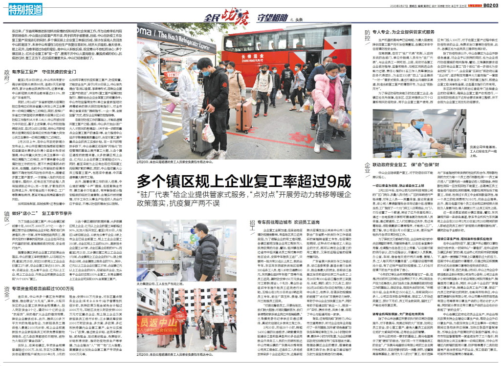 连日来,广东省统筹推进新冠肺炎疫情防控和经济社会发展工作。作为治愈率名列前茅的地级市,中山提出抗疫复产两不误,两手抓两手都要硬。目前,中山在防疫工作及复工复产双线进行的同时,多个镇区规上企业复工率超过