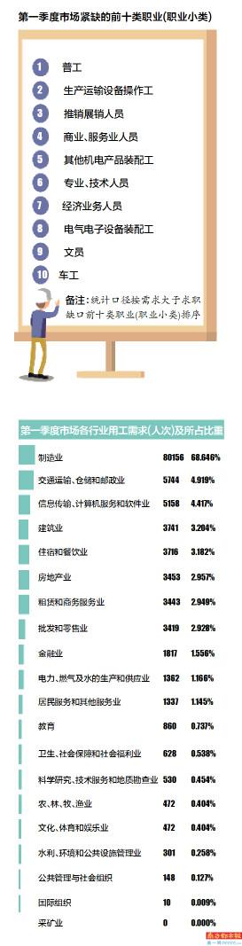 全市人力资源市场供求状况监测显示,第一季度制造业等用工需求较明显,需求人数所占比重的比值均在5%以上。其中,制造业一季度用工需求达80156人次,占一季度中山用工需求的68.646%;交通运输、仓储和邮政业用工需求5744人次,所占比重4.919%;信息传输、计算机服务和软件业用工需求5158人次,所占比重4.417%;建筑业用工需求3741人次,所占比重3.204%;住宿和餐饮业用工需求3716人次,所占比重3.182%;房地产业用工需求3453人次,所占比重2.957%;租赁和商务服务业用工需求3443人次,所占比重2.949%;批发和零售业用工需求3419人次,所占比重2.928%;金融业用工需求1817人次,所占比重1.556%;电力、燃气及水的生产和供应业用工需求1362人次,所占比重1.166%;居民服务和其他服务业用工需求1337人次,所占比重1.145%。