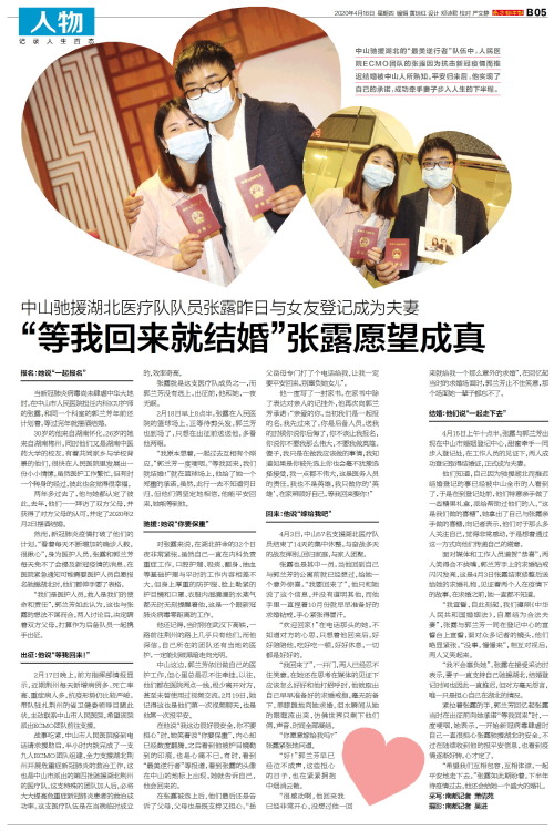 中山驰援湖北的“最美逆行者”队伍中,人民医院ECMO团队的张露因为抗击新冠疫情而推迟结婚被中山人所熟知。平安归来后,他实现了自己的承诺,成功牵手妻子步入人生的下半程。报名:她说“一起报名”当新冠肺炎病