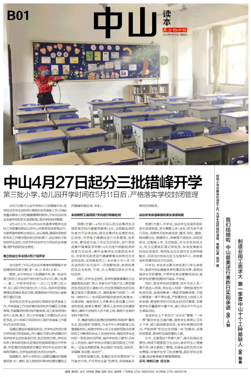 4月27日起中山全市学校分三批错峰开学;各学校应在学生返校前2周做好各项准备工作;加强4类重点群体人员的健康管理和服务;开学后启动学生体温申报和家长承诺制度,落实学校封闭管理。4月14日上午,中山市2