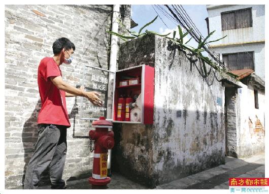 “村里的街道比较窄,如果发生火灾,消防车进到村内需要一段时间,所以我们在每个消防栓附近都设置了一个消防箱,配备了一些消防器材,在消防车到来之前,以备不时之需。”东区花苑社区党委书记、居委会主任黄敏锐介绍道,每个季度都会对消防栓进行全面的检查,看看是否通水、能正常使用,消防箱里的设备也会定期维护、更新、补充,近两年来陆续投入十万元用于购置消防设备。