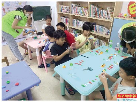在五沙村党群服务中心妇女儿童之家,刚满7岁的黄静雯小朋友,正在志愿者的指导下,亲手制作泥塑。虽然是第一次玩泥塑,在志愿者手把手的示范下,不一会黄静雯就制作出十多个“小辣椒”,又凭着自己的想象力将这些“小辣椒”组合成一朵花。“这朵花也是辣的,因为它是‘辣椒’做成的”,黄静雯告诉南都记者,以前从未玩过泥塑,今天在老师们的指导下完成了多个作品,很有成就感,“玩得很开心,希望以后能多举办泥塑课。”