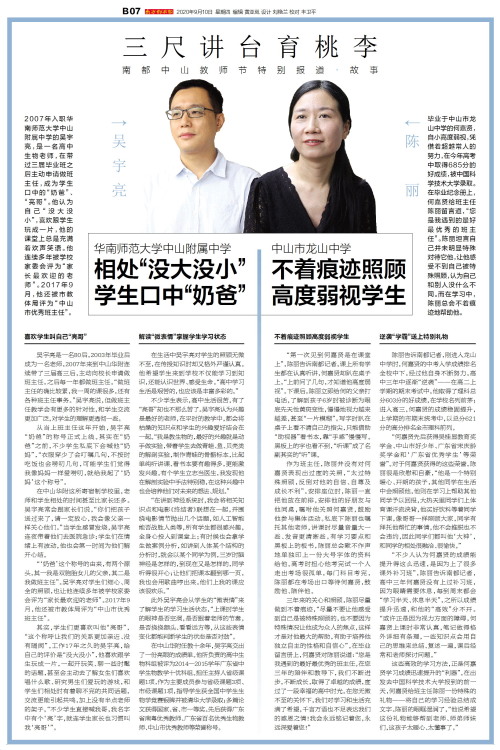2007年入职华南师范大学中山附属中学的吴宇亮,是一名高中生物老师,在带过三届毕业班之后主动申请做班主任,成为学生口中的“奶爸”、“亮哥”。他认为自己“没大没小”,喜欢跟学生玩成一片,他的课堂上总是充