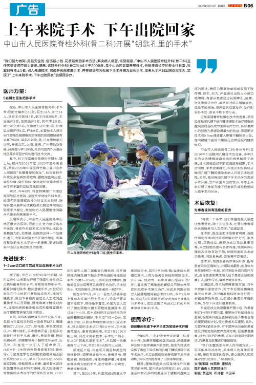 “我们努力做到,用最安全的、创伤最小的、花费最低的手术方法,解决病人痛苦,恢复健康。”中山市人民医院脊柱外科(骨二科)主任医师梁道臣博士表示。据悉,该院脊柱外科(骨二科)成立于2008年,是中山地区最