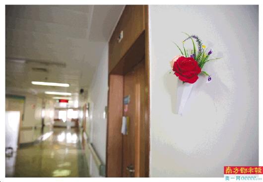 小榄人民医院肿瘤科,病房进门处插着绚丽的花枝,患者在房间内安静地坐着。