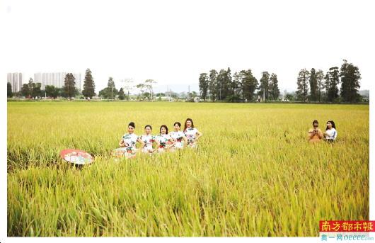 在美丽的乡村南朗左步村,穿着旗袍的女士在金黄稻田中拍照。