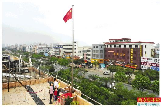 黄圃镇吴惠森老人带领家人在楼顶升起国旗。