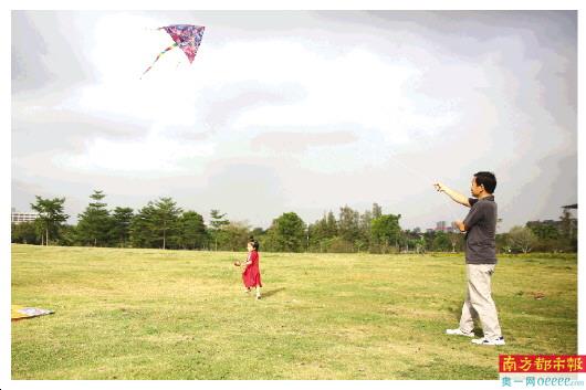 在开发区得能湖公园里,大人带领着小孩在草地上放风筝。