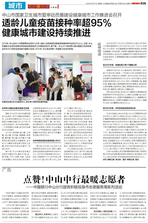 2019年,中山全市人均预期寿命达到80.93岁,适龄儿童免疫规划疫苗报告接种率均达到95%以上。日前,中山市国家卫生城市复审动员暨建设健康城市工作推进会召开,据了解, 中山10个镇街再次通过国家卫生