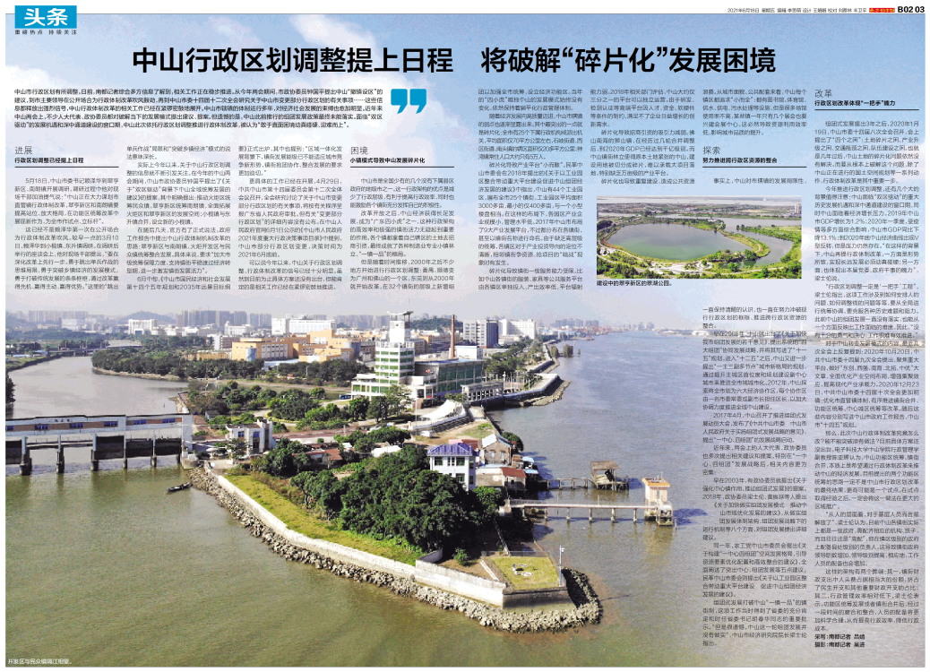 中山市行政区划有所调整。日前,南都记者综合多方信息了解到,相关工作正在稳步推进。从今年两会期间,市政协委员钟国平提出中山“撤镇设区”的建议,到市主要领导在公开场合为行政体制改革吹风鼓劲,再到中山市委十