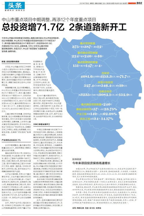 今年中山市重点项目数量又有增加。南都记者日前从中山市发改局获悉,经过中期调整,中山市2021年度重点项目由年初的375个增至387个,其中重点建设项目由224个增至240个,总投资由4081.6亿