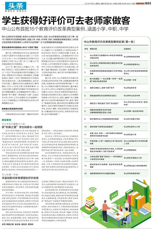 有什么样的评价指挥棒,就有什么样的办学导向。日前,中山市教育和体育局公布了第一批16个教育评价改革典型案例,涵盖小学、中职、中学等。同时,将根据改革推进情况,分阶段分批持续发布典型案例,以多种方式