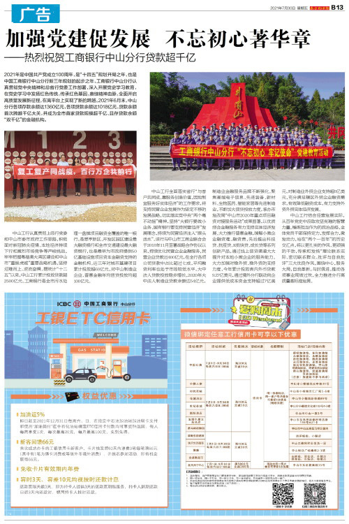 2021年是中国共产党成立100周年,是“十四五”规划开局之年,也是中国工商银行中山分行新三年规划的起步之年,工商银行中山分行认真贯彻党中央精神和总省行党委工作部署,深入开展党史学习教育,在党史学