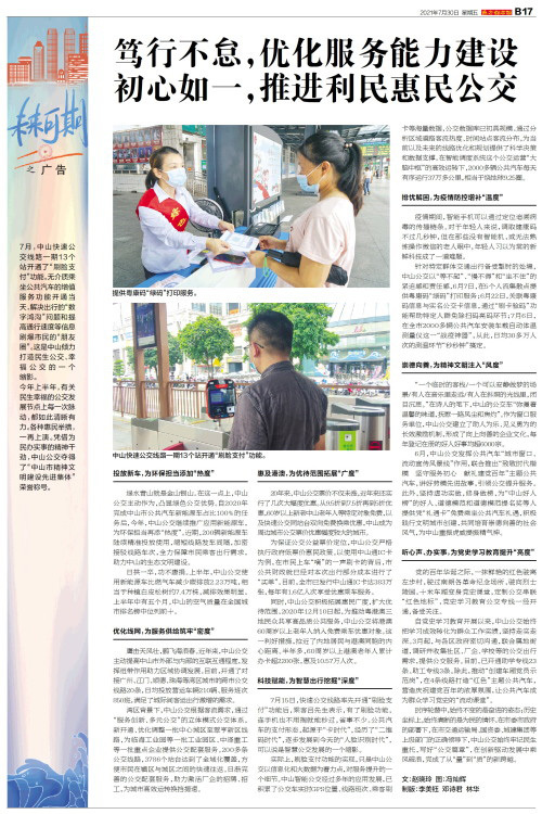 之专题 7月,中山快速公交线路一期13个站开通了“刷脸支付”功能。无介质乘坐公共汽车的增值服务功能开通当天,解决出行的“数字鸿沟”问题和提高通行速度等信息刷爆市民的“朋友圈”。这是中山倾力打造民