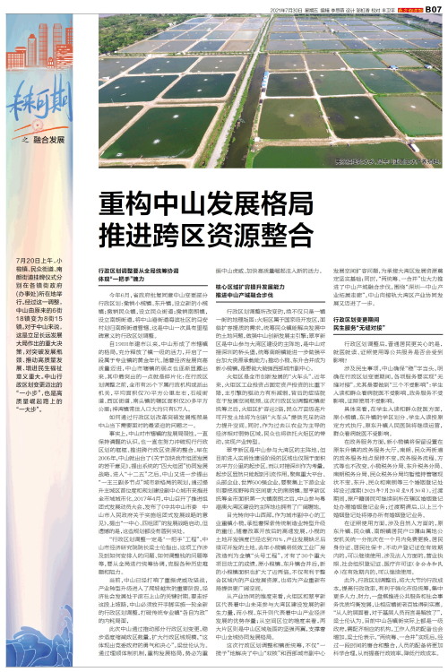 融合发展 7月20日上午,小榄镇、民众街道、南朗街道挂牌仪式分别在各镇街政府(办事处)所在地举行。经过这一调整,中山由原来的6街18镇变为8街15镇。对于中山来说,这是立足长远发展大局作出的重