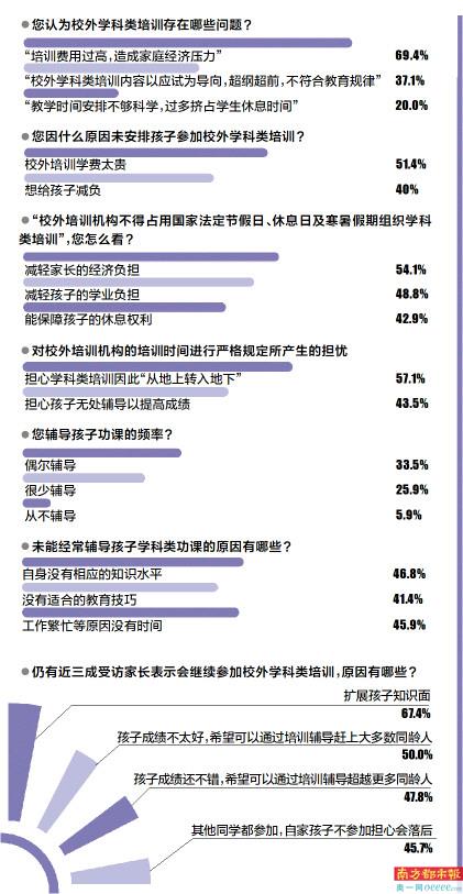 “双减”政策出台后,校外学科类培训有所降温,但仍有需求。有家长表示:学校考试的附加题会拉开学生分数和名次的差距,要拓展知识面,需参加校外培训“加餐”;孩子成绩不够理想,希望通过补课跟上班上的同学;因家有二娃而没时间精力辅导大娃,只好安排大娃继续参加培训。