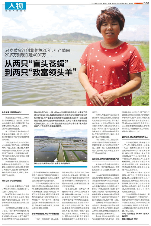 黄金连今年54岁,一家人在中山市板芙镇承包鱼塘,从事生产养殖业已经有26年,鱼塘承包面积由最初的30亩发展到现在的1000多亩,年产值由最初的20多万到现在近4000万,在创业致富的同时,也带动当