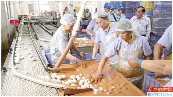 南方电网广东中山供电局黄圃分局工作人员,到泰和公司车间了解咸蛋加工生产情况。 陈世聪 供图