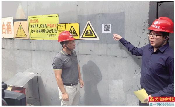 中山市生态环境局执法人员在工业园区张贴“环境健康码”。