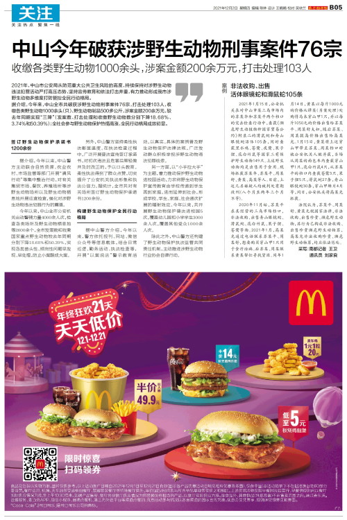 2021年,中山市公安局从防范重大公共卫生风险的高度,持续保持对涉野生动物违法犯罪活动严打高压态势,坚持宣传教育和依法打击并重,有力推动形成我市涉野生动物多维度打防管控全民行动格局。 据介绍,今