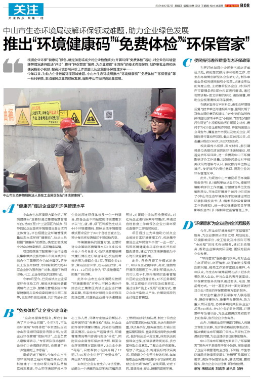 根据企业环保“健康码”颜色,确定加密或减少对企业检查频次;开展环保“免费体检”活动,对企业的环境管理等情况进行现场“问诊”;推行“环保管家”服务,为企业提供“全流程”的技术咨询服务;制作审批业务相