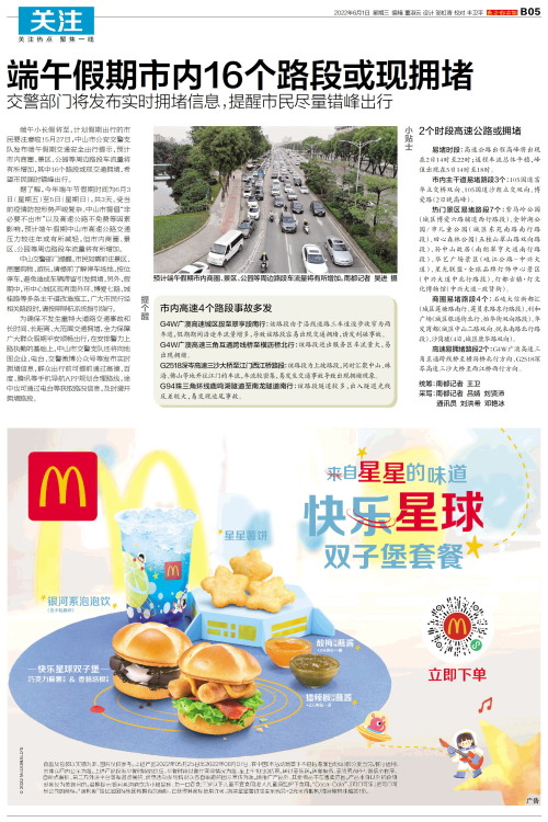 据了解,今年端午节假期时间为6月3日(星期五)至5日(星期日),共3天。受当前疫情防控形势严峻复杂、中山市提倡“非必要不出市”以及高速公路不免费等因素影响,预计端午假期中山市高速公路交通压力较往年或有所减轻,但市内商圈、景区、公园等周边路段车流量将有所增加。