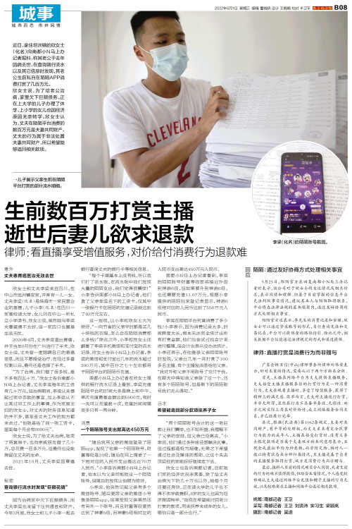 生前数百万打赏主播 逝世后妻儿欲求退款