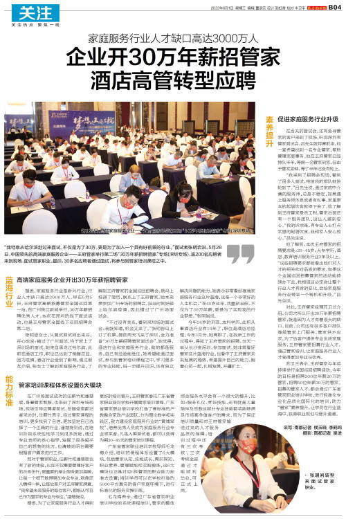 “我特意从哈尔滨赶过来面试,不仅是为了30万,更是为了加入一个具有好前景的行业。”面试者张明岩说。5月28日,中国领先的高端家庭服务企业——王府管家举行第二场“30万年薪招聘管家”专场(深圳专场)