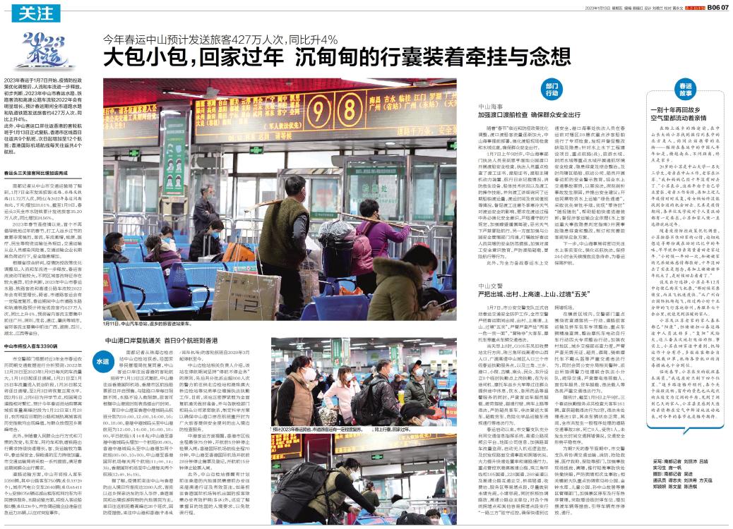 2023年春运于1月7日开始,疫情防控政策优化调整后,人流和车流进一步释放。初步判断,2023年中山市春运水路、铁路客流和高速公路车流较2022年会有明显增长。预计春运期间全市道路水路和轨道铁路发