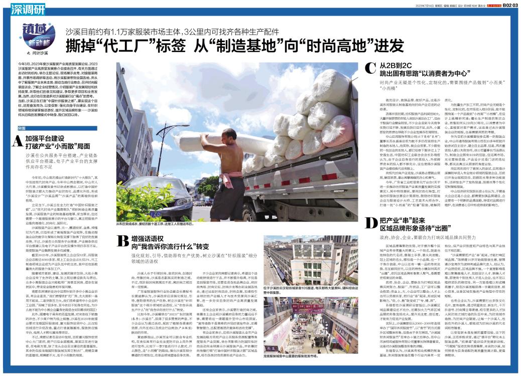 问计沙溪 今年3月,2023年度沙溪服装产业高质量发展论坛、2023沙溪服装产业高质量发展推介会接连召开,有关方面通过走访时尚机构、举办主题论坛、现场展示走秀、对接服装商圈、开展市场调研等活动,