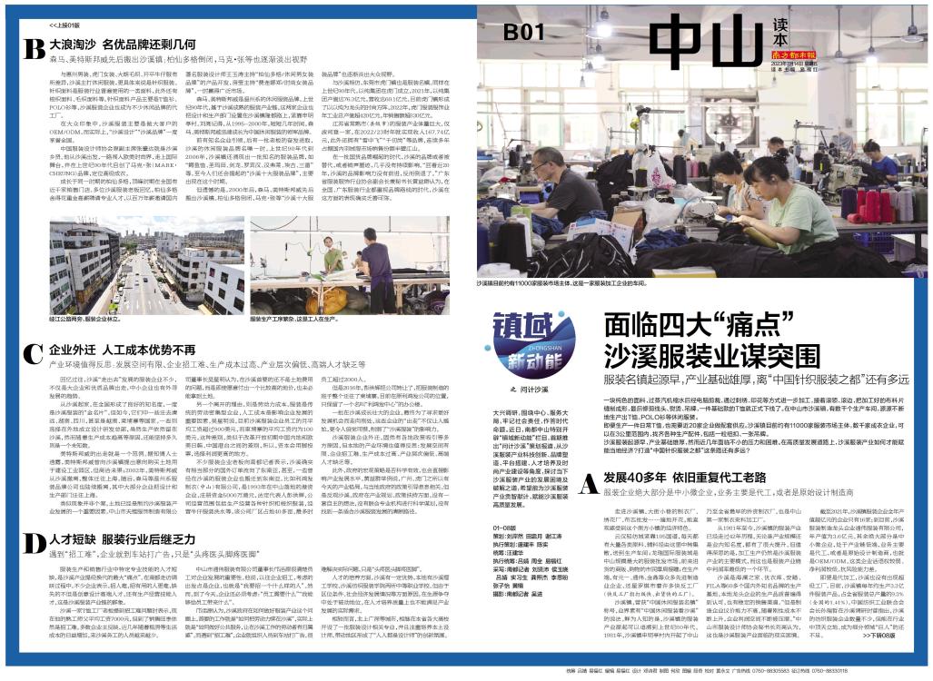 问计沙溪 大兴调研,围绕中心、服务大局,牢记社会责任,作答时代命题。近日,南都中山特别开辟“镇域新动能”栏目,首期推出“问计沙溪”策划报道,从沙溪服装产业科技创新、品牌塑造、平台搭建、人才培养及