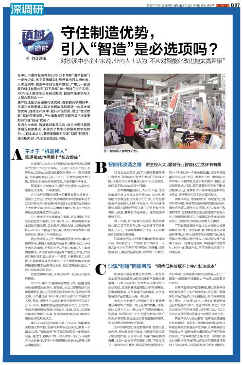 问计沙溪 在中山市通伟服装有限公司(以下简称“通伟服装”)一楼办公室,电子显示屏实时显示着当日车缝件数、入库合格率、残退率等各项生产数据;广东元一智造服饰科技有限公司(以下简称“元一智造”)生产