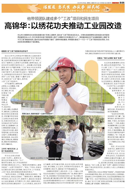 人物 中山市小榄镇东区社区规划发展办部门负责人高锦华,是社区“工改”党员突击队队长。计算机信息管理专业的他是社区内部培养的建筑专业人才,2023年获评中级工程师职称,获评“小榄镇2023年度标兵